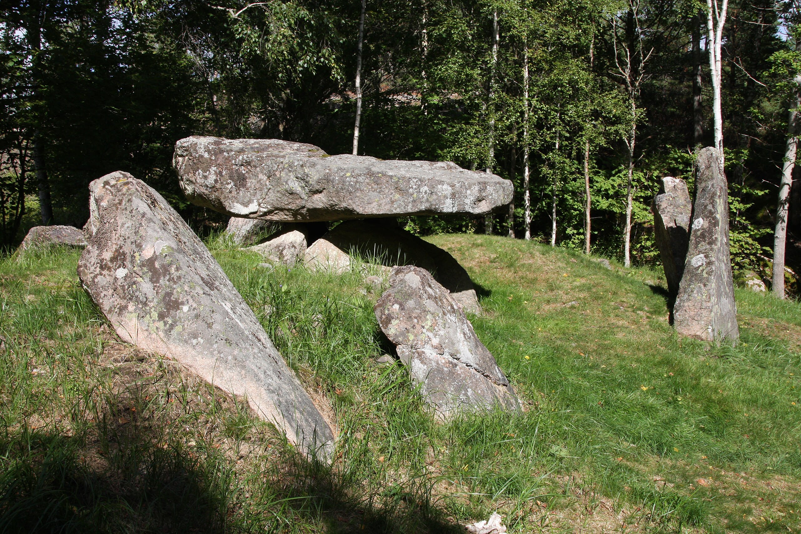 The Vrangstads Long Dolmen was built by Funnel Beaker culture communities around 3500-3000 BCE, making it one of the oldest monuments in Sweden. The surrounding Iron Age grave field, dating to approximately 500 BCE-500 CE, demonstrates that the landscape was recognized as sacred for over three millennia.